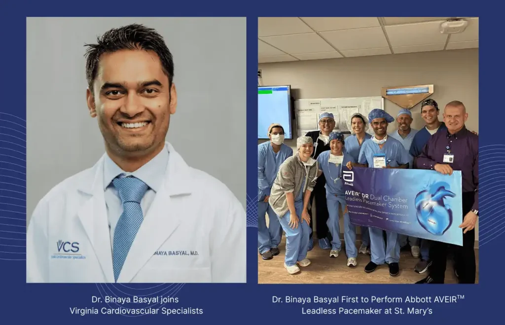 Richmond, VA (October 1, 2025)–Virginia Cardiovascular Specialists (VCS), Central Virginia’s largest independent cardiovascular practice, proudly announces that Dr. Binaya Basyal has joined its team of expert physicians. Dr. Basyal has already achieved a remarkable milestone at St. Mary’s Hospital, where he performed the facility’s first implant of the Abbott AVEIR™ leadless pacemaker—the world’s first-of-its-kind leadless pacemaker system. This accomplishment highlights both his expertise and the strong collaboration between VCS and its hospital partners.